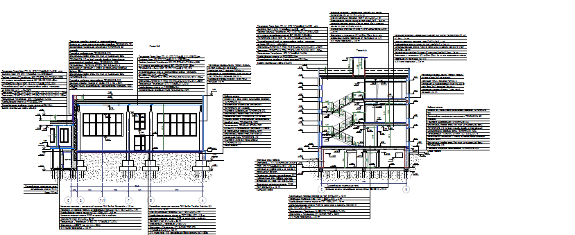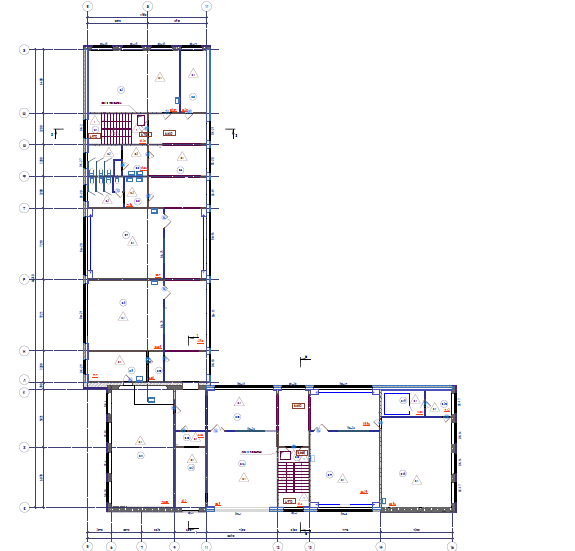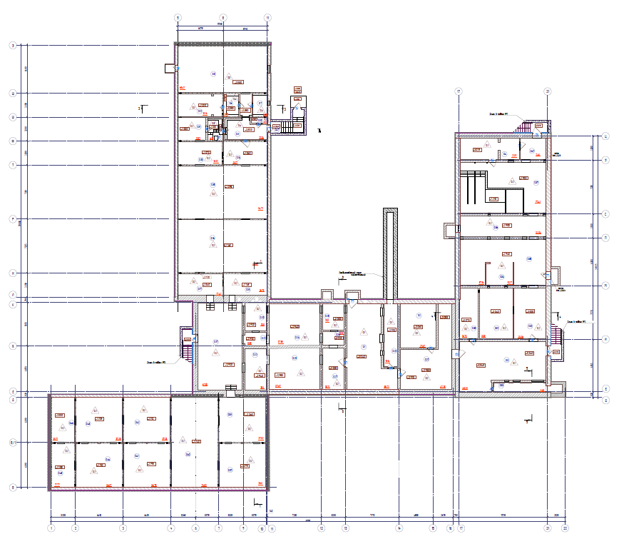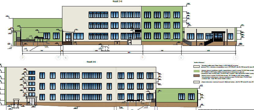 Здание школы построено по типовому проекту 221-1-313, сложной формы в плане. Размеры здания в осях 68,61х64,47 м. Условно, здание школы разделено на 5 блоков: Блок «А» – 3-х этажный, с подвалом, расположен в осях 6-14/Е-К. Блок имеет размеры в осях 34,4х12,0 м. В блоке «А» расположен главный вход в школу, а также следующие помещения вестибюль с гардеробом, рабочие кабинеты, кабинет директора, электрощитовая, серверная, учебные классы, кладовые, санитарные комнаты. Блок «Б» – 3-х этажный, с подвалом, расположен в осях 5-9/Л-Э. Блок имеет размеры в осях 33,6х12,0 м. В блоке «Б» расположены следующие помещения - учебные классы, лаборантские, кладовые, санитарные комнаты. Часть подвальных помещений здания оборудованы под спортивные учебные классы. Блок «В» – одноэтажный, с подвалом, расположен в осях 1-9/Б-Д. Блок имеет размеры в осях 28,8х12,14 м. В блоке «В» расположены следующие помещения - кабинет технологии (мальчиков и девочек), учебные классы, кладовые, санитарные комнаты, помещение медицинского пункта. 4. Блок «Г» – одноэтажный, с подвалом, расположен в осях 15-19/Е-Ц. Блок имеет размеры в осях 34,4х11,96 м. В блоке «Г» расположены следующие помещения - обеденный зал с кухонными помещениями, умывальная, кабинет заместителя директора по АХЧ, тренажёрная, санитарные комнат, раздевальные помещения для мальчиков и девочек при спортивном зале (с душевыми). 5. Блок «Д» – одноэтажный, без подвала, расположен в осях 13-20/А-Д. Блок имеет размеры в осях 17,8х17,6 м. В блоке «Д» расположены следующие помещения – актовый и спортивный зал, подсобные помещения. Фундаменты блоков «А», «Б», «В» и «Г» - свайный, с монолитным железобетонным ленточным ростверком, шириной 360-1220 мм, высотой сечения 400 - 600 мм. Столбчатые ростверки размером в плане 2300х2300 мм, высотой 1000 - 1060 мм. Фундаменты блока Д здания – столбчатые на забивных сваях. Продольное армирование ростверко выполнено арматурой класса АIII ф10-14 мм, поперечное арматурой класса АI ф8 мм. Сваи забивные железобетонные квадратного сечения 300х300мм, шаг свай от 1,2 до 3,9м, длина свай составляет 5,8 м. Продольное армирование свай выполнено арматурой класса АIII ф10 мм, поперечное арматурой класса АI ф6 мм. Прочность бетона железобетонных свай соответствует класссу В25-В50, прочность бетона ростверков соответствует классу В25-В35. Сопряжение ростверков со сваями предусмотрено с заделкой в тело ростверка выпусков арматуры на 250 мм, что согласно СП 24.13330.2021 "Свайные фундаменты" является жестким спряжением. По существующим ростверкам блока «В», «Г» и «Д» предусмотрено устройство железобетонных фундаемнтных балок сечением 400х500(h) мм, из бетона кл. В20, F1 150, W4, армированные арматурой класса А400 из стали марки 25Г2С по ГОСТ 5781-82 и горячекатаная арматурой класса A240 из стали марки Ст3пс по ГОСТ 5781-82. Плиты перекрытия и покрытия – сборные железобетонные преднапряженные (для пролетов 6,4м и 7,2м) и с обычным армированием (для пролетов 3,2м) многопустотные, толщиной 220 мм, с опиранием по двум сторонам на наружные и внутренние стеновые панели и доборные ригели. В бдлоке «Д» опирание плит покрытия выполнено по двум сторонам на ж/б тавровые балки. Плиты перекрытия длиной 3,2 м армированы пятью стержнями арматуры класса АIV ф14 мм, плиты перекрытия длиной 6,4 м армированы четырьмя стержнями арматуры класса АIV ф14 мм, плиты перекрытия длиной 7,2 м армированы четырьмя стержнями арматуры класса АIV ф18 мм