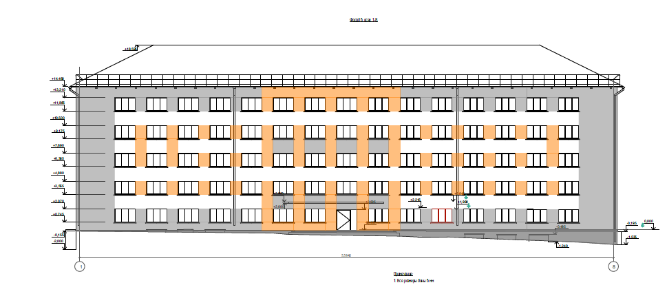 Здание общежития для студентов 1966 г. постройки – 5 этажное с подвалом и чердачным помещением. Общие габаритные размеры здания – 55,0х14,9 м, высота здания 14,5 м (высота этажей – 2,6 м). Количество жилых комнат – 99. Общая полезная площадь здания – 3991,1 кв.м., в т.ч.: жилые помещения (полезная площадь) – 2985,2 кв.м; в т.ч. жилой площади – 1712,2 кв.м. Объем здания – 14146 куб.м. Здание оборудовано системами инженерно-технического обеспечения (в настоящем заключении не рассматривается. Обследование систем и сетей здания предоставляется в виде отдельных томов (разделов) и т.п.). В здании имеются системы водоснабжения и водоотведения, газоснабжение, отопление и вентиляция, электроснабжение, слаботочные системы (пожарная сигнализация, видеонаблюдение, телефонизация и т.п.). В подвале здания расположены душевые, раздевалки, вспомогательные технические помещения, а также помещения хранения спортивного инвентаря (лыжная база). На первом этаже здания расположены помещения столовой с набором вспомогательных и подсобных помещений; вестибюль и читальные залы; помещения административно-управленческого персонала, а также другие вспомогательные помещения. Со 2-го по 5-й этажи в здании располагаются помещения жилых комнат с набором вспомогательных помещений. Здание общежития запроектировано в 1961 г. на основании Типового проекта № 1-300-2М «Общежитие для студентов на 400 учащихся с кирпичными стенами» (модернизированное) с привязкой к местным условиям и заданию Заказчика. В отличии от типового проекта здание запроектировано с подвалом для хозяйственных помещений. Внутренний ж/б каркас здания по типовому проекту заменен на продольные кирпичные стены с устройством в них вентиляционных каналов. На все изменения разработаны изменения и корректировки, отраженные в проектной документации В конструктивном отношении здание бескаркасное с продольными и поперечными несущими кирпичными стенами. Фундаменты здания выполнены ленточными на естественном основании - сборные из бетонных фундаментных блоков типа ФБС, подошва фундаментов – из сборных ж/б блоков по типу ФЛ. Стены подвала – сборные ж/б блоки с докладкой из керамического полнотелого кирпича марки М100 на растворе марки М50, толщина стен подвала – 510 мм. Наружные стены – из семищелевого кирпича, толщина стен 510 мм. Внутренние стены из силикатного кирпича. Столбы на 1-м этаже выполнены сечением 770х640 мм из кирпича марки М100 на растворе М50 с армированием кладочной сеткой. Для общей жесткости здания на отм. -0,450 м, -1,80 м, -2,40 м, - 3,00 м, + 8,065 м, +13,665 м в здании выполнены железобетонные диафрагмы из бетона марки М200 и арматуры из стали Ст5. Перегородки здания в сухих помещениях – из гипсоопилочных плит толщиной 80 мм; в санузлах и душевых – из шлакоблоков толщиной 90 мм. Перекрытия – из сборных железобетонных панелей с круглыми пустотами и из плоских железобетонных плит. Лестницы – сборные ж/б лестничные площадки и марши. Кровля здания скатная – стропильная система из деревянных элементов.