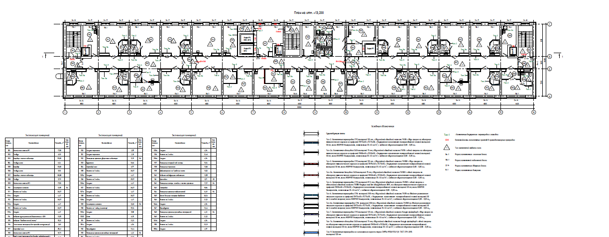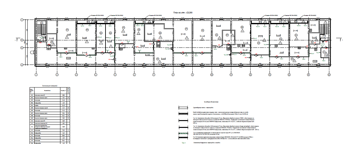 Конструктивная схема здания – каркасно-стеновая. Пространственная жесткость каркаса здания обеспечивается совместной работой продольных и поперечных стен и дисков перекрытий, покрытия и стен лестничных клеток. Наружные стены выполнены из керамзитобетонных укрупненных блоков, толщиной 500 мм. Внутренние стены выполнены из сборных керамзитобетонных блоков, толщиной 400 мм и кладки кирпича керамического, толщиной 380 мм, стены выходов на кровлю выполнены из сборных керамзитобетонные блоков, толщиной 400 мм. Конструкция перекрытия – сборные ж/б балки и сборные железобетонные плиты перекрытия серийного производства. Лестничные марши - крупноразмерные сборные железобетонные. В рамках капитального ремонта объемно-планировочные решения и функциональное назначение помещений не изменяется. Технико-экономические показатели здания соответствует существующим. Изменение функциональной пожарной опасности, степени огнестойкости и класса конструктивной пожарной опасности здания – не предусматривается. Степень огнестойкости, класс конструктивной пожарной опасности, существующая высота здания (23,15 м), а также площадь этажа в пределах пожарного отсека (не более 1 413,2 м2) соответствуют требованиям ч. 4 ст. 4 123-ФЗ в части исполнения требований пожарной безопасности, действовавших до дня вступления в силу положений 123-ФЗ. Подвал состоит из 2-х уровней. Нижний уровень расположен в осях 1-3/А-Г на отм. -6.400. Там размещены помещения уборочного инвентаря, временного хранения трупов, лифтовый холл, выход в подземный переход, ведущий к корпусу и ССК. Верхний уровень подвала расположен на отм.-3.300 и занимает весь этаж здания, там размещены помещения хранения, санитарные комнаты, гардеробы и раздевалки персонала с санузлами и душевыми, аппаратная и кроссовая, ИТП, венткамеры и инженерные помещения, комнаты персонала, санпропускник, лифтовые холлы, выход в подземный переход, ведущий в корпус №12 и пищеблок, выход в подземный переход к бомбоубежищу.